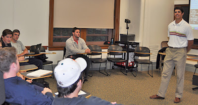 Students in the forum have not had to leave campus to apply the lessons they have learned in the classroom. In a guest blog post, men’s tennis co-captain Steve Hauser ’11, who is also a member of the football team, wrote about the parallels between a